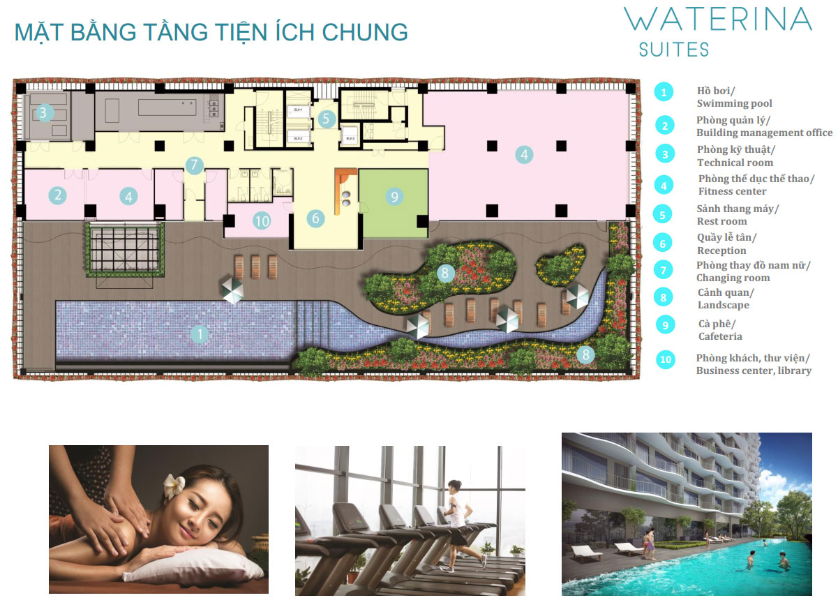 Căn hộ Waterina Suites sở hữu khối đế tiện ích cao 4 tầng tiêu chuẩn hoạt động 5 sao với tầng trệt là sảnh đón cư dân sang trọng, trần cao 5m, các cửa hàng tiện lợi, nhà hàng, cafe, phòng khám quốc tế, khu vui chơi trẻ em, vườn cảnh quan, khu tiệc nướng BBQ…Những tính năng bảo mật của căn hộ sẽ mang đến cho bạn sự an toàn tuyệt đối và những phút giây hoàn hảo trong mọi không gian.