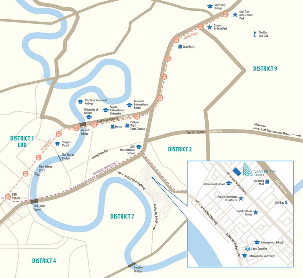 Căn hộ Waterina Suites thuộc khu đô thị Thạnh Mỹ Lợi đắc địa ngay trong trung tâm hành chính của Quận 2, trước mặt dự án là dòng sông Sài Gòn xanh mát uốn quanh, từ vị trí dự án Waterina cư dân dễ dàng kết nối và di chuyển vào trung tâm hiện hữu của thành phố (quận 1, 3, 5) và trung tâm tài chính tương lai – khu đô thị Thủ Thiêm.